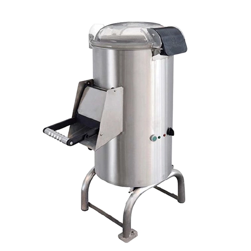 Cet éplucheur de pommes de terre commercial utilise un mécanisme motorisé avec des rouleaux ou des brosses internes rugueux. Les pommes de terre sont projetées de haut en bas à plusieurs reprises par la force centrifuge de la rotation à grande vitesse, subissant une friction totale contre les surfaces rugueuses de la paroi intérieure et du fond du rouleau, ainsi que contre les autres pommes de terre. Cette friction uniforme et continue décolle rapidement et en douceur la peau des pommes de terre.